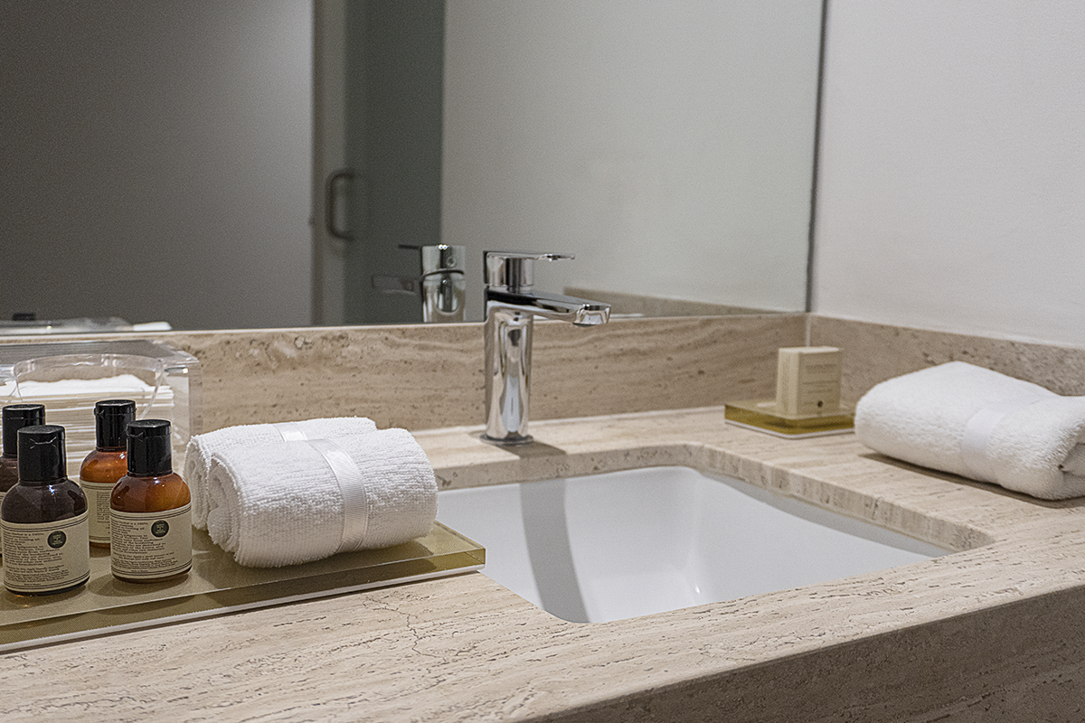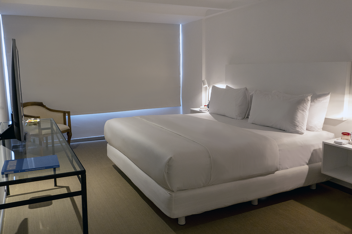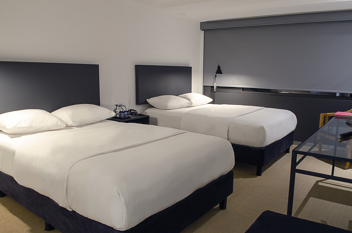 Cama extragrande o dos matrimoniales fabricadas con materiales hipoalergénicos y antibacteriales de alta calidad, sábanas de 300 hilos. Baño recubierto en suelo y paredes de mármol travertino con compartimentos separados entre regadera, lavabo e inodoro, ducha de lluvia y de mano, grifería de acero inoxidable y amenidades ecológicas.